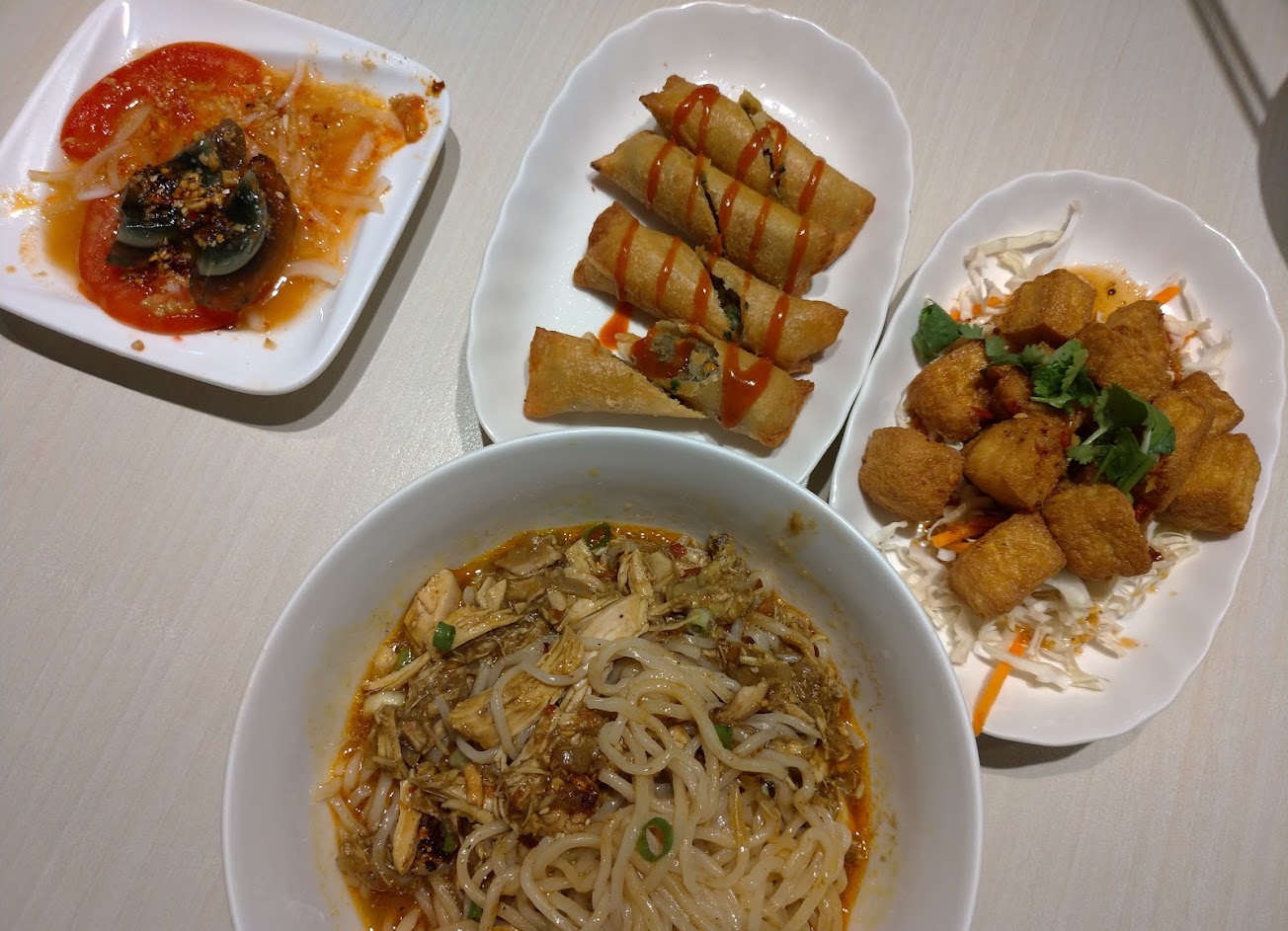 這次點了主食涼麵以及米線,小菜則有皮蛋、大薄片、椒麻雞(素)、印度鬆餅,涼麵部分比一般台灣常見的涼麵,更吃的到花生粉的口感,口味略酸甜,而米線則是酸辣口味,處理的非常好吃。