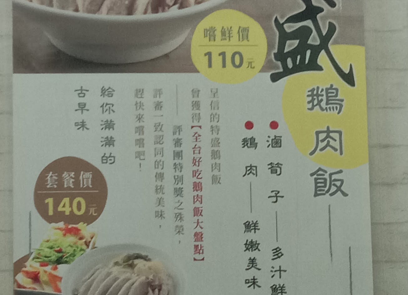 雖然店家說Google評論五星贈送小菜一份,但我實在無法給5顆星!鵝肉多汁好吃,但是份量非常之少,點的是「特盛鵝肉飯」店家說鵝肉的份量會比「鵝肉飯」多1倍,有沒有我不知道但是跟圖片比起來也差太多?完整的鵝肉片只有三片其他都是碎肉,只好靠無限量供應的鵝肉湯填飽肚子。