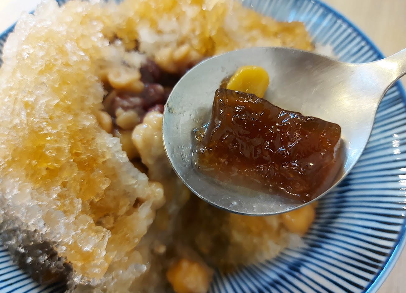 簡單的花生雪花冰,搭配黑糖粉粿跟綜合圓,口味蠻好吃的,口感很細緻,也不會太甜,比起夜市裡的店家,感覺更優秀一些,看了評論沒點到杏仁豆腐有點可惜