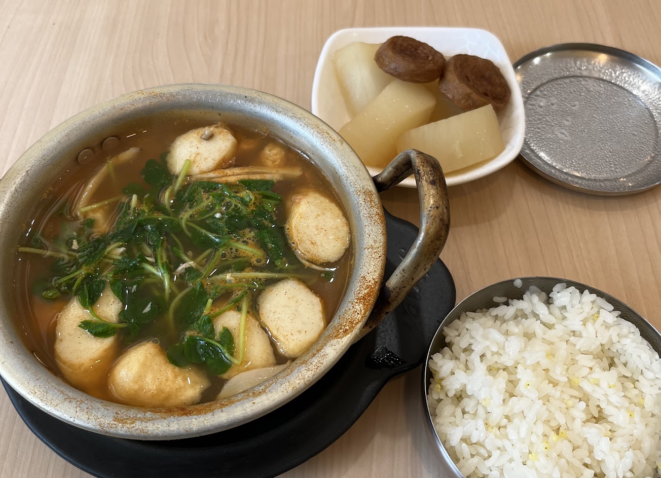 必點好喝海帶湯是一大碗裡面有大量海帶芽跟好幾顆新鮮蛤蜊(一開始還以為送錯不敢喝,因為菜單上的價格太便宜了)! 餐廳附的白飯圓潤有加小米很健康,自製泡菜較脆偏酸不辣.黃豆牙拌麻油還算清爽,涼拌小木耳脆口微酸! 泡菜炒牛肉是用辣炒年糕的醬炒泡菜.牛肉片.洋蔥絲.黃豆芽.蔥花吃起來香卻不會太刺激! 韓式煎餃皮Q不軟爛.內餡泡菜微辣肉紮實好吃! 海鮮煎餅蝦.章魚.蔥放很多.外皮酥軟入口即化! 石鍋冬粉炒牛肉的韓式冬粉很會吸附醬汁,冬粉充滿牛肉的鮮甜味,大量的牛肉片跟吃到最後都是熱的冬粉感覺很舒服!