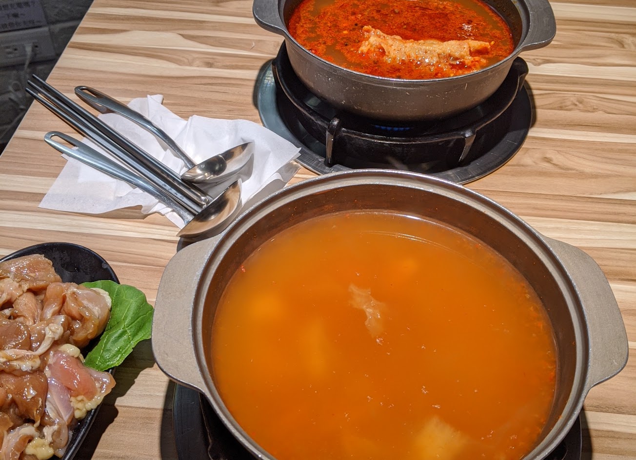 點了麻辣湯底味道還不錯,朋友點泡菜覺得普普,口味部分就見仁見智,但光是等菜盤就等了半小時,白飯碗也沒給,如果不提醒服務生真的不知道要等多久,比我晚入桌的客人食材都上齊了,我還是只有湯底。