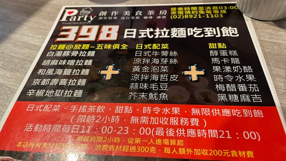 路過看到拉麵吃到飽398/人,體驗了一次,有五種拉麵,六種日式小菜,六種甜點,多種茶飲。小菜和甜點一般般,飲料點了奶蓋紅茶、珍珠奶茶、蜂蜜綠茶、洛神蜂蜜,三個人吃了九碗拉麵,14碟小菜,13碟甜點,份量都是少少的,所以要一直點,吃完後覺得拉麵吃到飽的方案不優,CP值不高,398補30元可以去吃韓國烤肉吃到飽。