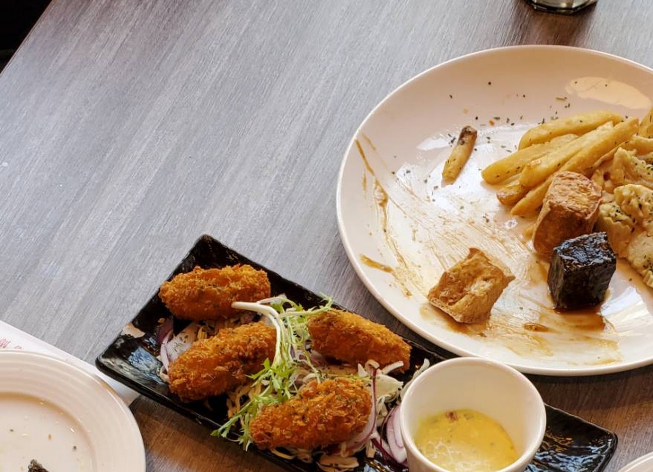 主要是來吃開胃小點,印象較深的有小蕃茄,炸物,炸功很不錯;巧克力厚片吐司,吐司吃起來還好,但配上超邪惡的巧克力醬吃起來有種爽度在,可綜合掉吐司的缺點,很想再多吃一個;小香腸應是煎的吧?外觀看起來相當可口,蠻油的,但至少沒有討人厭的臭火搭,且還有附上蒜片真的太棒了;蝦仁燒賣皮有點乾,比較可惜。