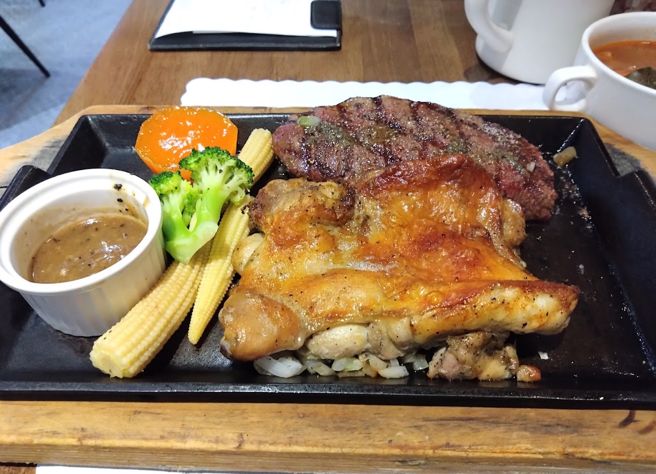 我們點了牛雞雙拼,五分熟的牛排剛剛好,去骨雞腿排皮煎的脆脆,雞肉很嫩,另一份沙朗牛是七分熟,比較有口感,喜歡軟嫩的還是五分比較合適。冰水果茶裡有新鮮水果,酸酸甜甜的很適合在夏天喝,焦糖布丁的奶蛋味都很足夠,而且看的到香草籽,不是用香草精。自助吧的牛肉湯真是名不虛傳,料多到爆,濃郁好喝,紅茶也不會太甜,整體來說餐點都很好吃,老闆出餐都是小跑步,服務也很用心,是一間值得排隊的店。