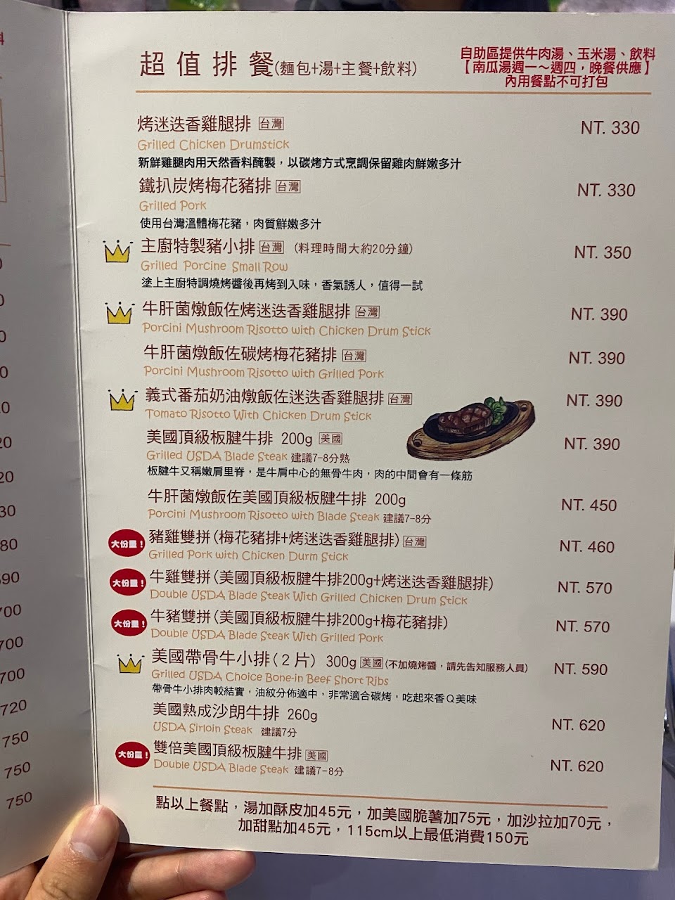 主餐燉飯和大塊美國板腱牛排一次滿足,牛肉湯滿滿牛肉,飲料自助!