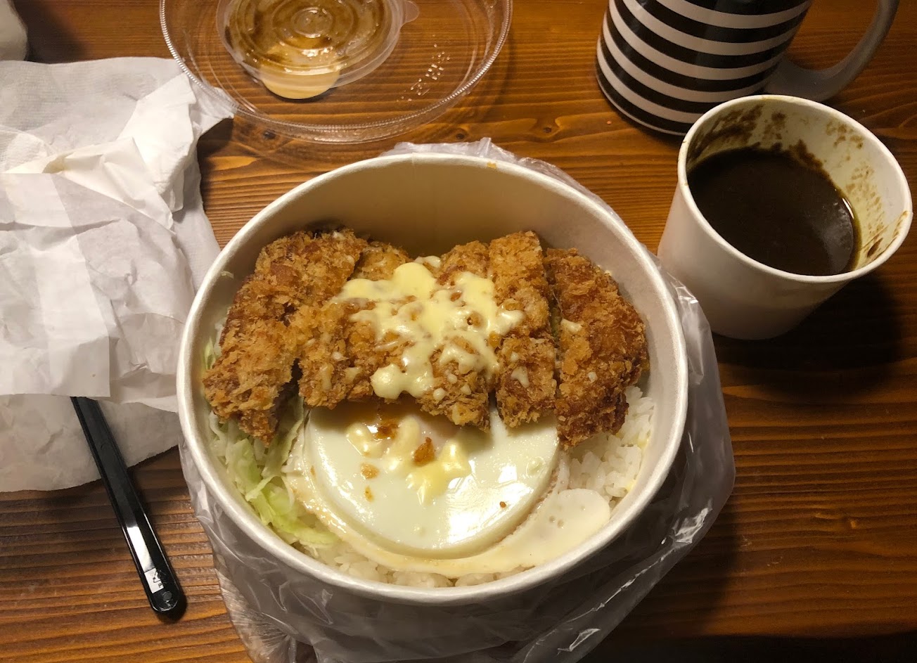 好吃,是很濃郁的咖哩,如果以甜咖哩跟鹹咖哩來分,屬於鹹咖哩,搭配白飯與豬排剛剛好,不會有太鹹或是配飯後咖哩被白飯稀釋掉的問題,微甜的高麗菜絲與豬排一起入口可以減輕油膩感,但由於咖哩醬很濃稠不容易擴散到整份飯裡,所以如果不是直接把豬排與半熟蛋翻開直接將咖哩倒在飯上的話,有可能咖哩醬會被豬排吸掉不少,飯也無法全部吸收到咖哩醬,喜歡吃濕濕湯湯的咖哩飯的人,原本的咖哩醬可能不夠,但由於咖哩醬本身就很濃郁,所以如果加點咖哩醬的話,也不要全倒下去避免口味過重,豬排的話若以豬排專賣店的厚切豬排來比較的話,大概是2/3或是1/2的厚度,不會有像某些豬排一樣有油臭味,但說不上出色,如果可以再瀝多點油可以更好,半熟蛋跟玉米筍沒有特別的感想,整體來說咖哩醬真的很優,就綜合來說是好吃的。