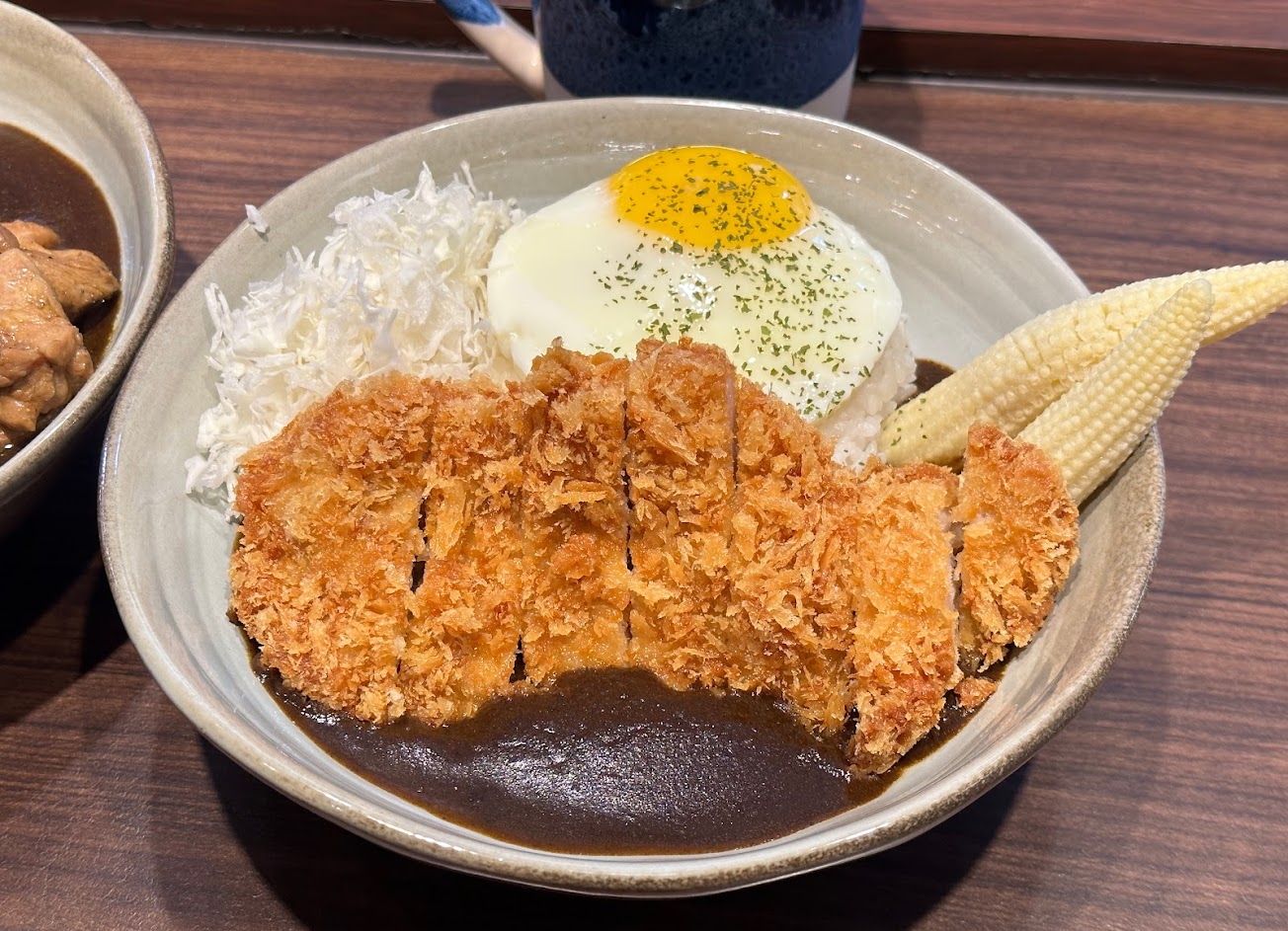 炸豬排咖哩:豬排很嫩,還有加高麗菜絲、玉米筍、半熟蛋,整碗吃完也不會覺得負擔很重。