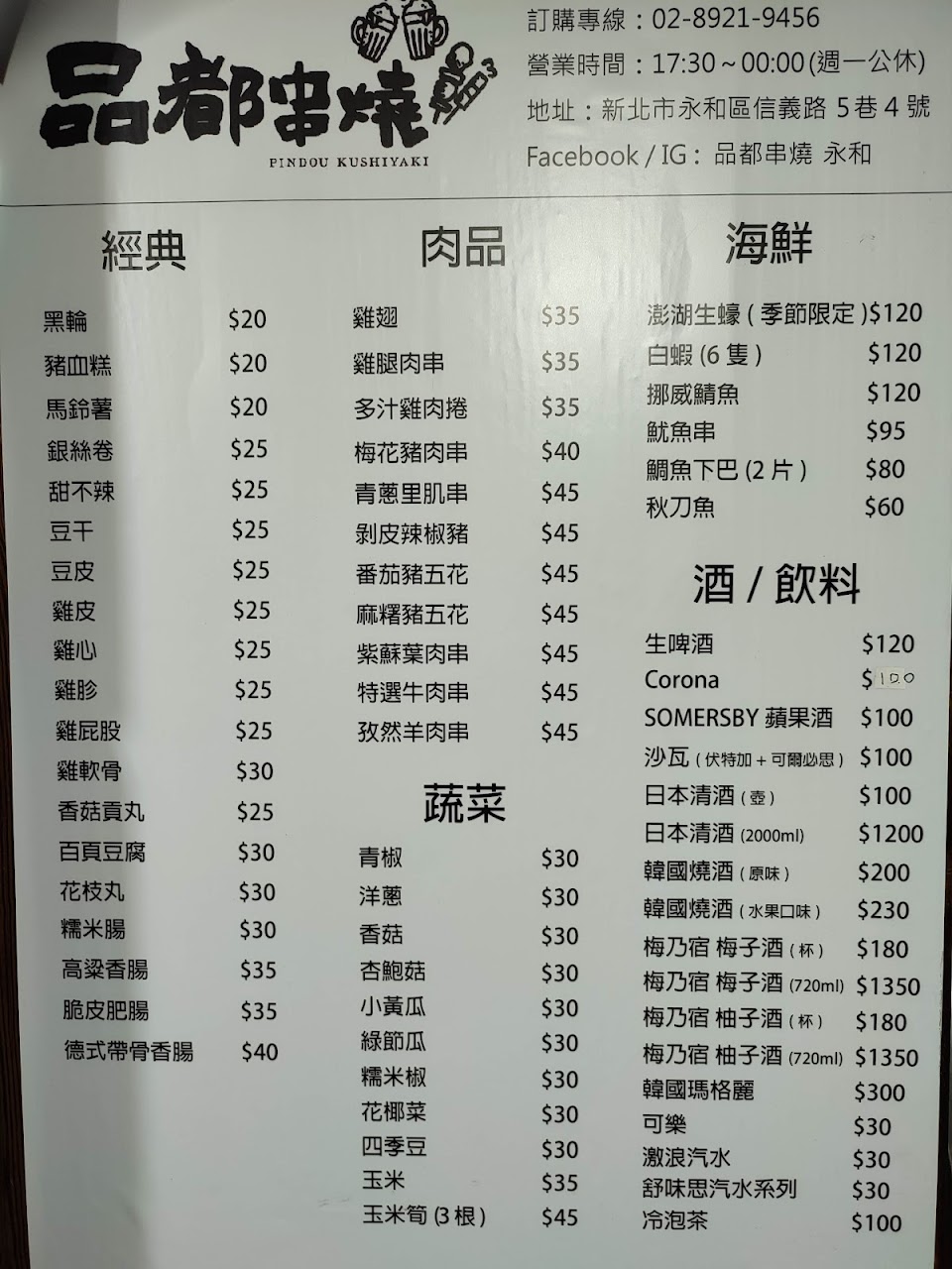 2024最新在地推薦餐廳的菜單_品都串燒 永和的菜單、圖片