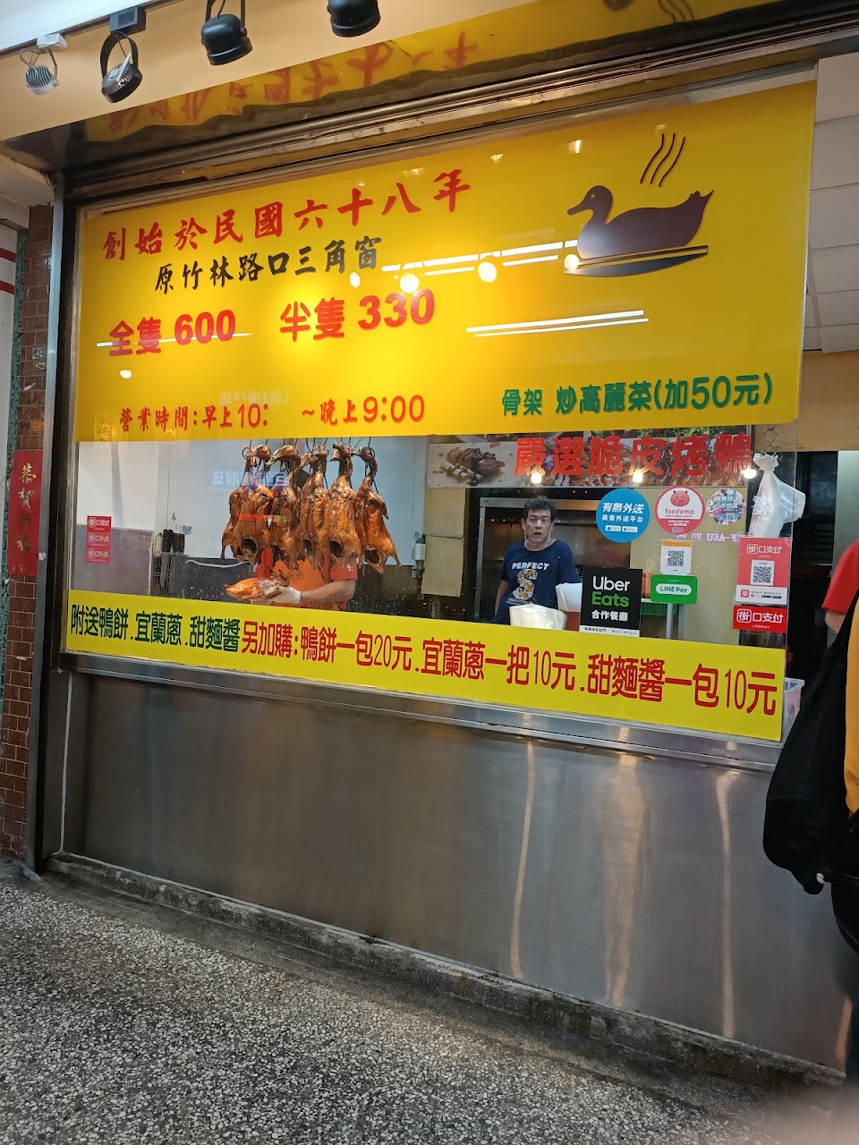 這是永和的烤鴨三吃老店, 在周遭附近更換幾次地點, 就是不離開十字路口附近。 外帶過許多烤鴨三吃, 還是覺得這家好吃。 與其他參賽得獎的其他店家比較, 美味真不輸他們 鴨肉剁開時流出的肉汁,香氣四溢。 切開肉片,鴨皮油亮多汁, 鴨骨快炒,更是喜歡啃食的最愛, 不過仍有可惜之處, 店員在門口抽菸的氣味與形象, 流動率太高的切鴨皮人員, 刀工素質有些落差, 價格也一直反應物價成本 我是永和人, 我支持永和在地美食, 請店家也盡量平價給在地人享用。