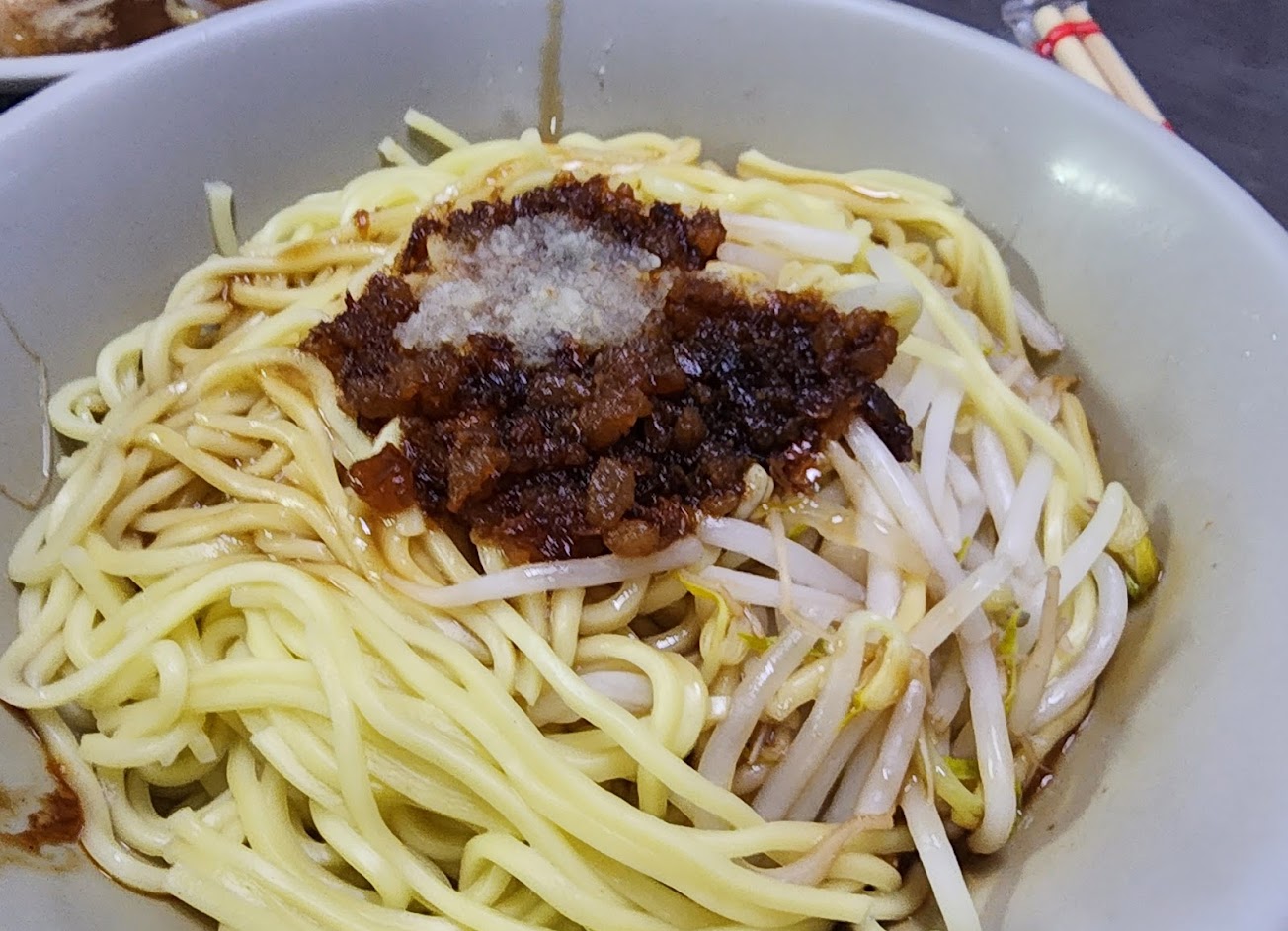 ?印象中第一次看到乾麵,沒有肉燥就只有簡單的豆芽、沙茶還有桿麵醬汁,怎麼跟認知的乾麵有點差異,還在疑惑的同時,吃下第一口的瞬間,就知道為什麼這麼簡單的乾麵,卻有著讓人著迷的味道,通常吃鍋燒麵烏龍麵會加入沙茶,但乾麵搭配沙茶的,暫時很難想到第二家,而乾麵好吃與否,醬料的搭配非常重要,好吃的就是讓人一口接著一口吃不停。