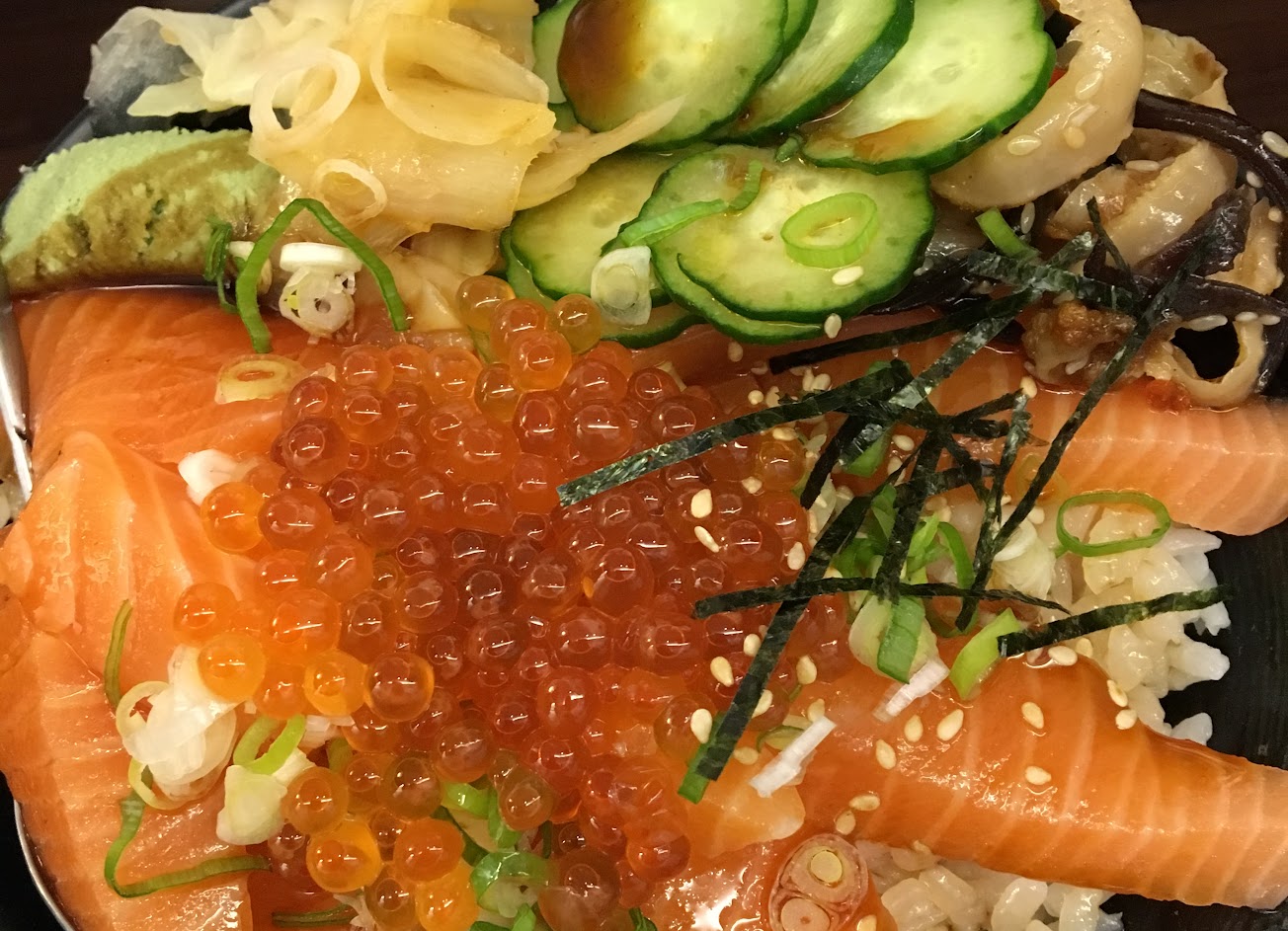 3.但因為我點了熟食海鮮丼飯,一上桌我真的覺得自己點錯了,擺盤上感覺可以再優化一下,有點亂亂的;約莫3-4種不同魚類,炙燒烤熟後的魚肉片、鮑魚片、干貝唇、蟹肉棒等食材。