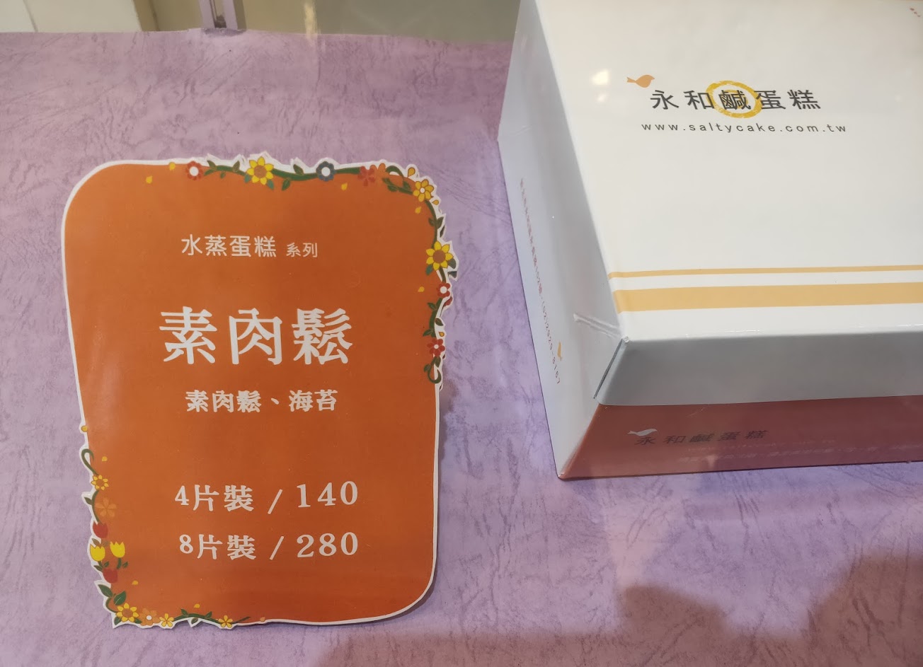永和永貞路的這家鹹蛋糕店,其主要蛋糕有水蒸蛋糕系列(傳統葷及素肉鬆),低糖蛋糕系列(芋頭捲,鹹乳酪,布丁燒及厚巧克力),小點心系列(麻糬豆沙鍋餅,牛軋餅及鬆餅),共三大系列,既然是鹹蛋糕為名的店,當然就要先點鹹蛋糕來吃,這次我買了傳統葷食的鹹蛋糕,其口味就像傳統味的鹹糕餅,只是用蛋糕的方式呈現,像是變鬆厚的糕餅,蛋糕很鬆軟Q,內餡分部蠻均勻的,內餡料是微鹹的,搭配其蛋糕吃真的很特別的口味,還蠻好吃的,會很容易一口接著一口吃,第一次吃的人也會感覺是不錯吃的點心,我個人覺得鹹蛋糕是可達4.5顆星,店內非常整潔乾淨,只能外帶,傳統葷食的鹹蛋糕基本4塊為一盒,價格160元,也有大盒裝,一盒320,店內其他產品也做的很好吃,不過,鹹蛋糕很特別,我還是力推它!