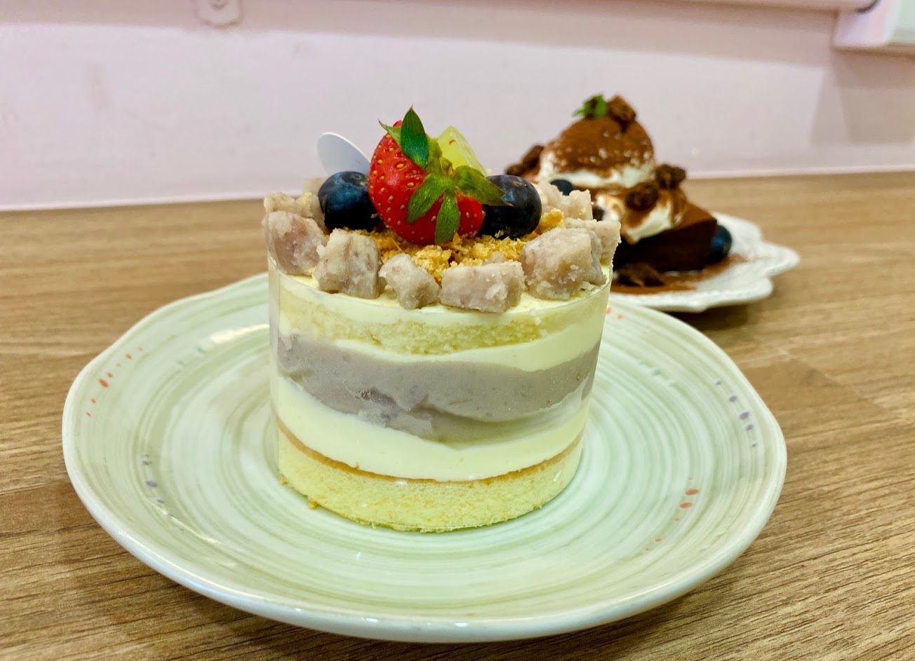 我們買走了最後一個芋香協奏曲,上方擺上芋頭塊,中間夾入鮮奶油、乳酪和芋泥,濃郁且綿密的口感在口中化開,真的很好吃!鹽之花焦糖也是店家招牌之一,細緻的鮮奶油淋在戚風蛋糕上,杏仁片的香氣散發,鹹甜滋味讓我們讚不絕口!