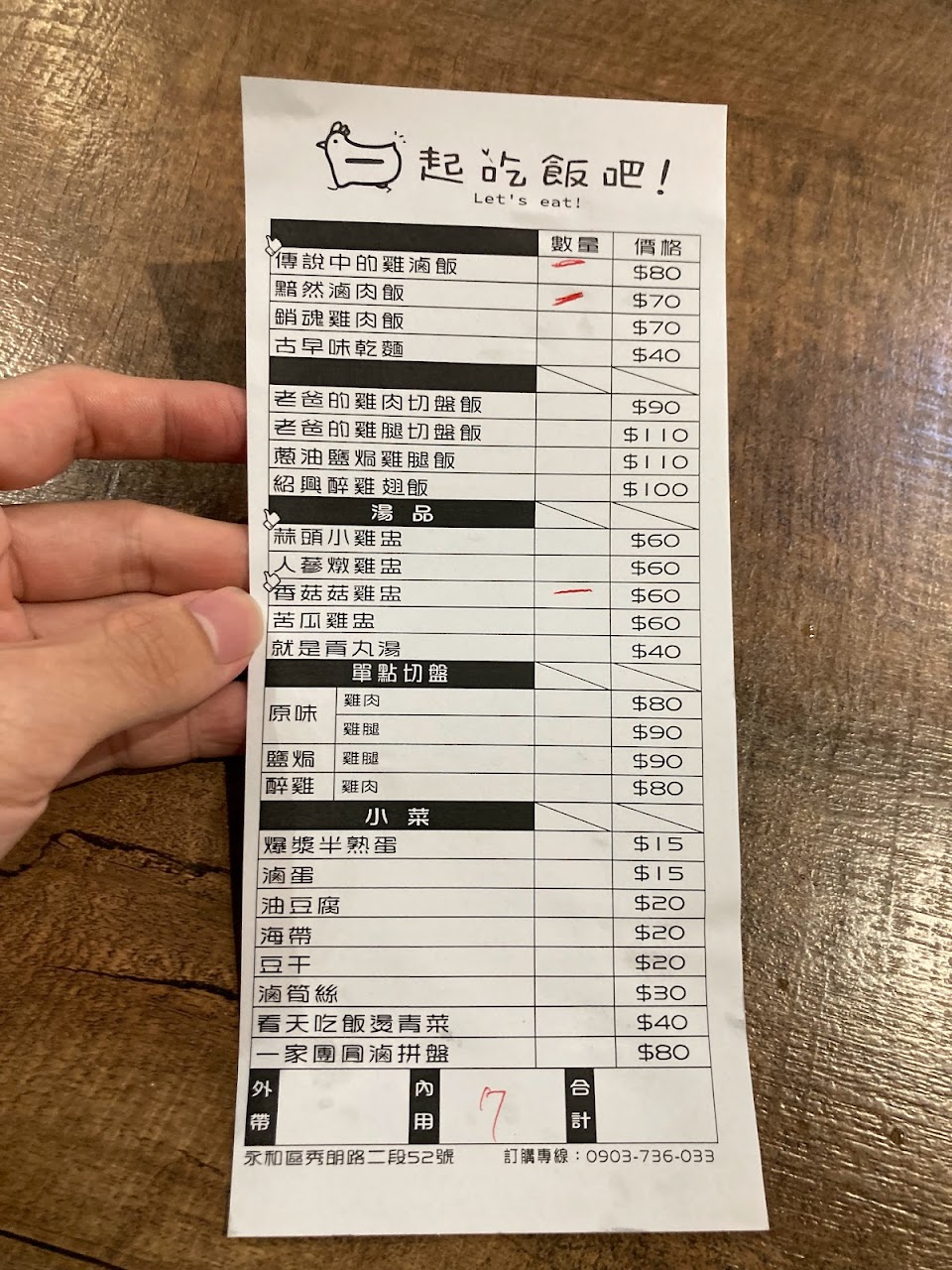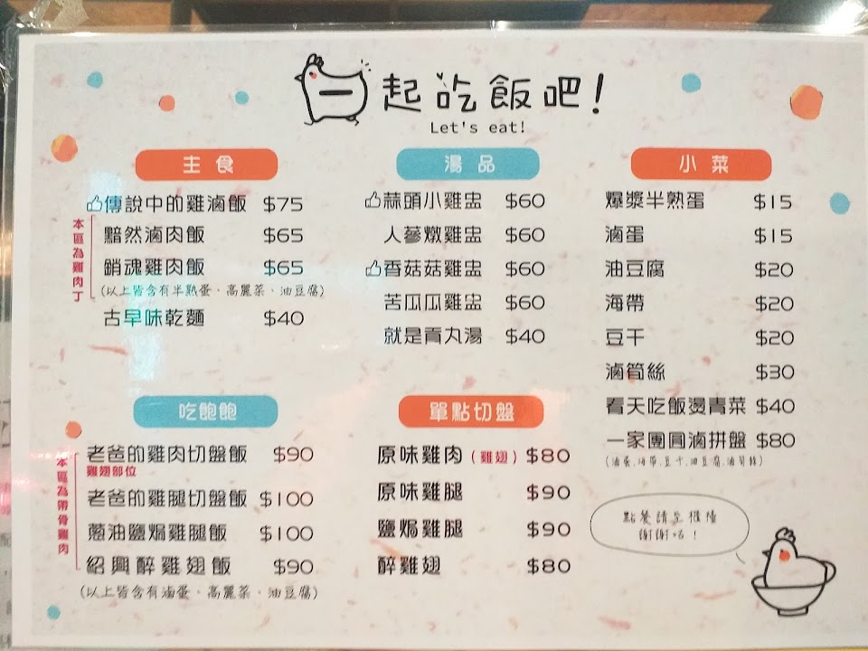今天在一起吃飯吧用餐,點了幾種餐點,傳說中的雞滷飯綜合了雞肉飯的甜和滷肉飯的鹹,雞肉乾柴沒有雞肉本身的香氣,銷魂雞肉飯偏甜,二種飯量很足,整體還可接受,一家團圓滷拼盤主要為油豆腐,豆干,海帶,滷筍絲及滷蛋,滷筍絲充滿了漂白水的味道,真的,可惜了這滷筍絲,然而在整盤上淋的醬油膏真的很死鹹,也是出乎意料之外,香菇菇雞盅的湯品有一個煮的很容易骨肉分離的雞翅,但卻沒有香菇入味,雞湯也沒什麼香菇味,當然湯內有六朵小香菇,但整體就是喝不出香濃的香菇雞湯味,總之,今日點的餐點所體現出來食物色是不錯,但香及味還有努力空間,特別是今日4/2滷筍絲的漂白水味,店家真的可品嚐看看就知道了!