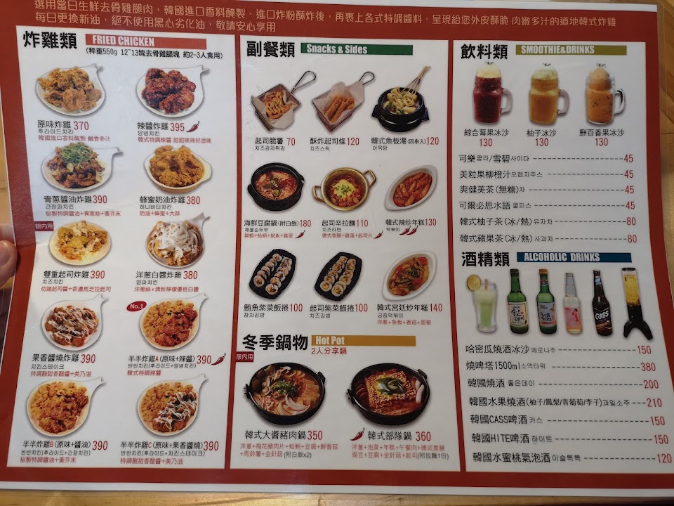 一樣看評價來的,結果很失望。炸雞很普通,辣醬口味更是不堪,可能是個人不愛韓式炸雞。部隊鍋就是一鍋加了豆腐、罐頭肉的泡麵…很普通。炸起司條很糟糕,不僅有些微冰,更不用想拉絲。唯二可以的是魚板和蜂蜜奶油炸雞…其他的可以自己斟酌,服務態度是ok的。