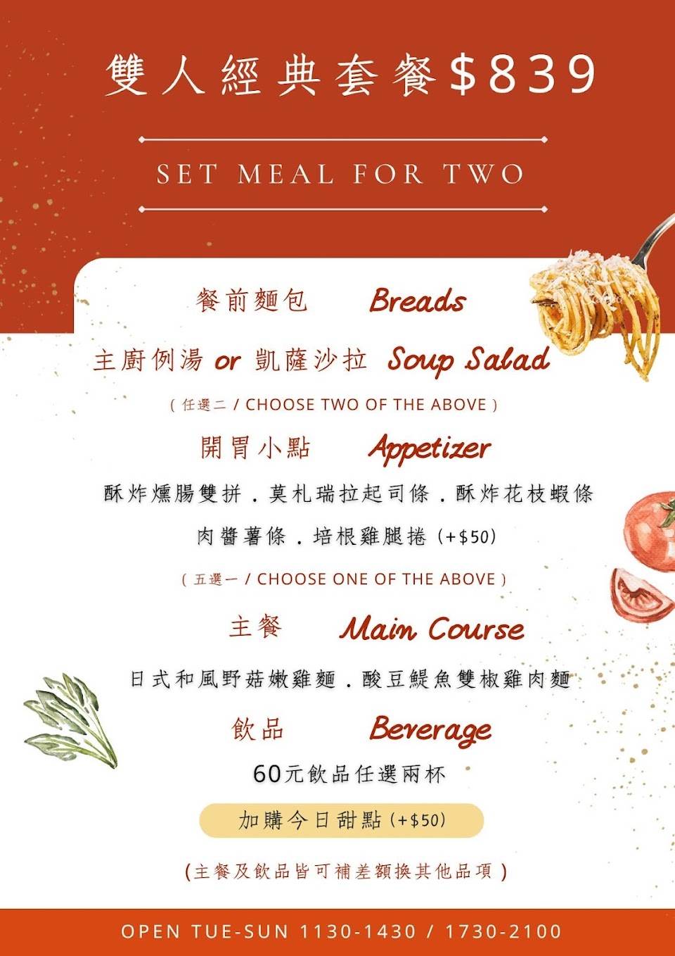 今天和老婆一起來嚐鮮,點了耶誕雙人套餐,分別選了番茄紅醬海鮮麵跟紅酒牛肉燉飯,附餐選了沙拉跟湯各一,都相當好吃,開胃菜肉醬薯條也相當有特色,結束後的甜點藍莓奶酪也吃得出真材實料,吃完相當滿足,以後會再訪跟推薦家人朋友來用餐~