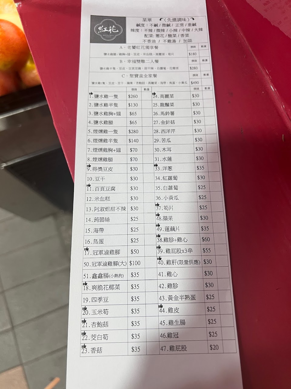 優點是檯面品項擺設乾淨說明清楚,劃單時每樣的單價感覺都不高,調味還可自行勾選,可惜是份量與一般鹽水雞相比實在過少,最後附上晚餐隔壁買的飯加湯,還比紅花便宜了一些,看來只能發薪日打牙祭,平常日隔壁夜市或路上應有更多的選擇。