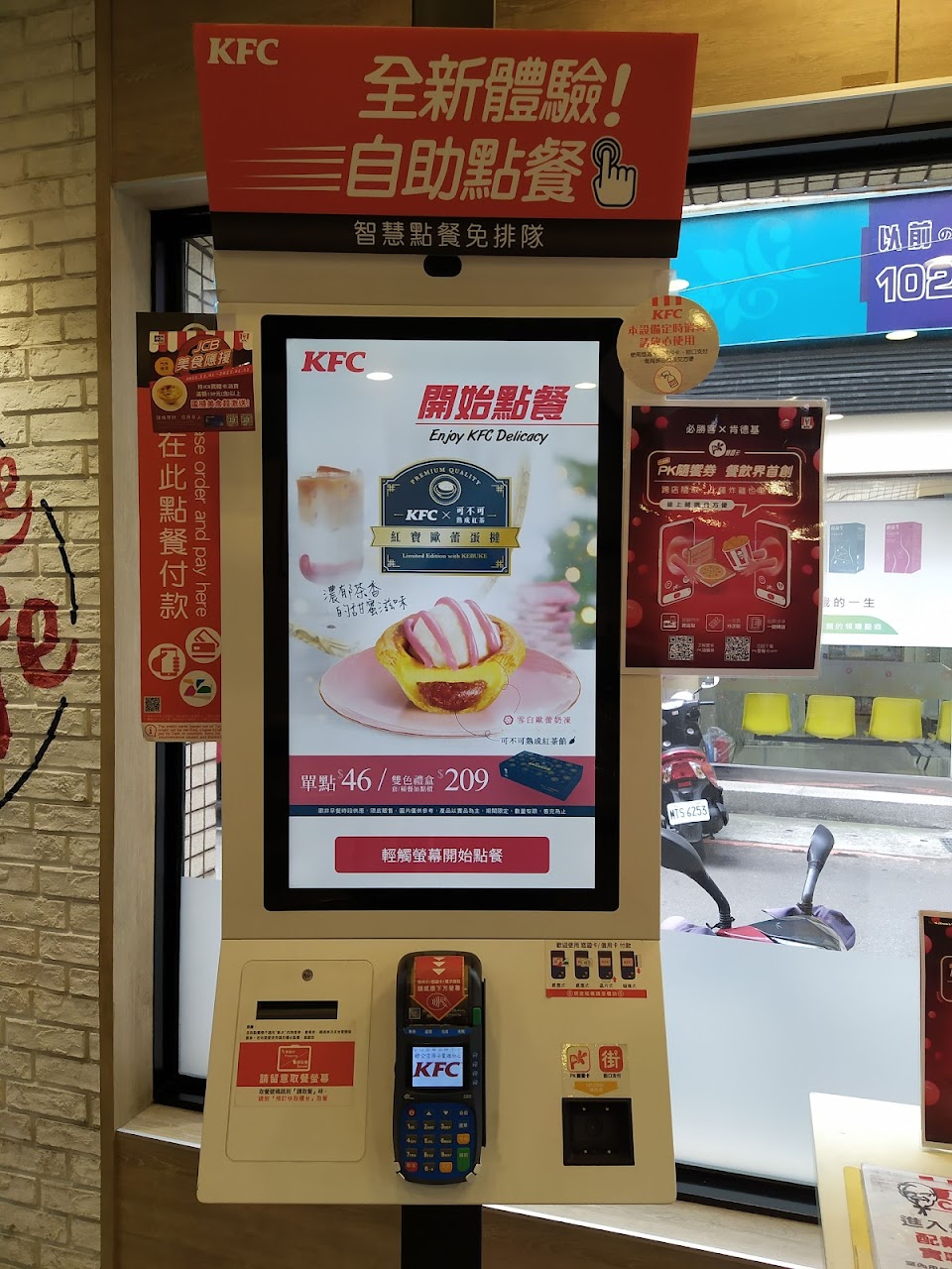 永和區中正路上的肯德基速食餐飲剛好在巷子口,二樓用餐區可以悠閑的喝咖啡看街景,這裏還有專供行動不便的顧客坐上樓的自動椅,很貼心的服務,