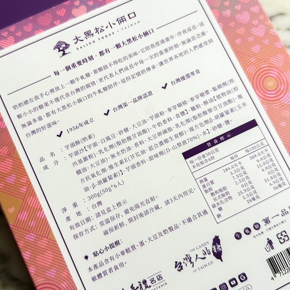 大黑松小倆口系列產品:牛軋糖和大餅都很可口好吃,門市人員服務熱忱又親切!送禮自用兩相宜~