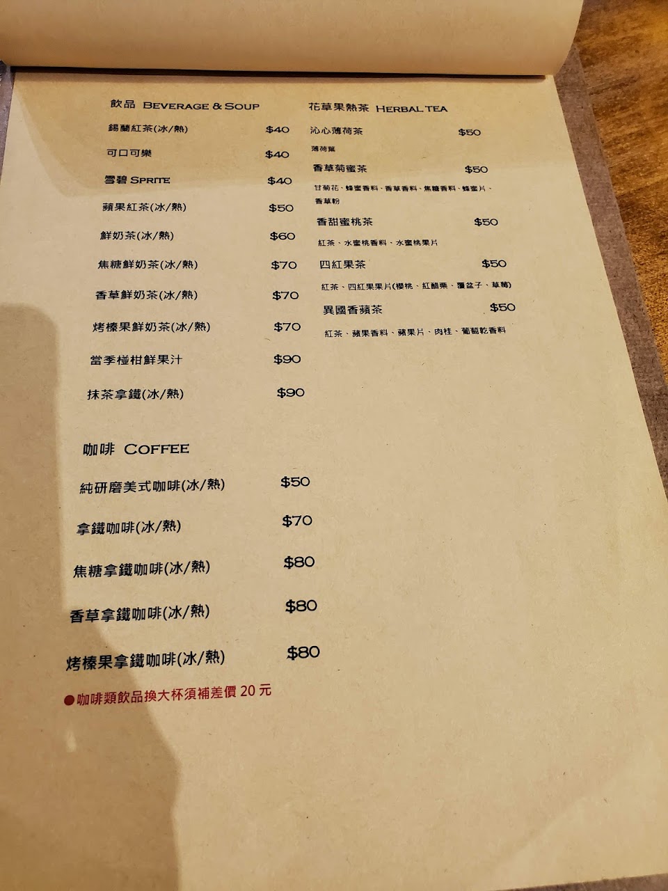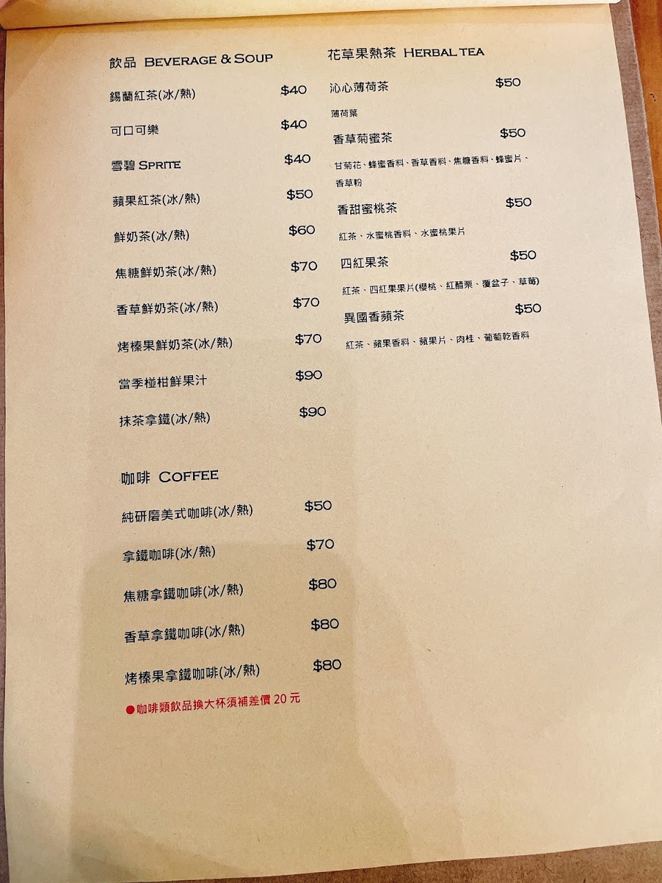 *主餐有附紅茶/可樂/雪碧(三選一),其他選項可加價。